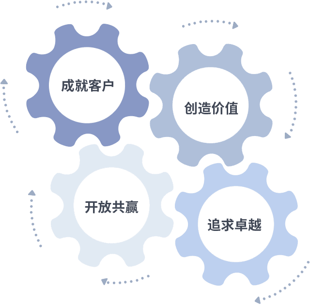 成就客户是一切决策的出发点,,,创造价值是衡量所有工作的标准,,,追求卓越是我们做事做人的态度,,,开放共赢是我们的格局也是最终的结果。。。价值观的齿轮环环相扣,,推动着组织里的每个人不断向前。。