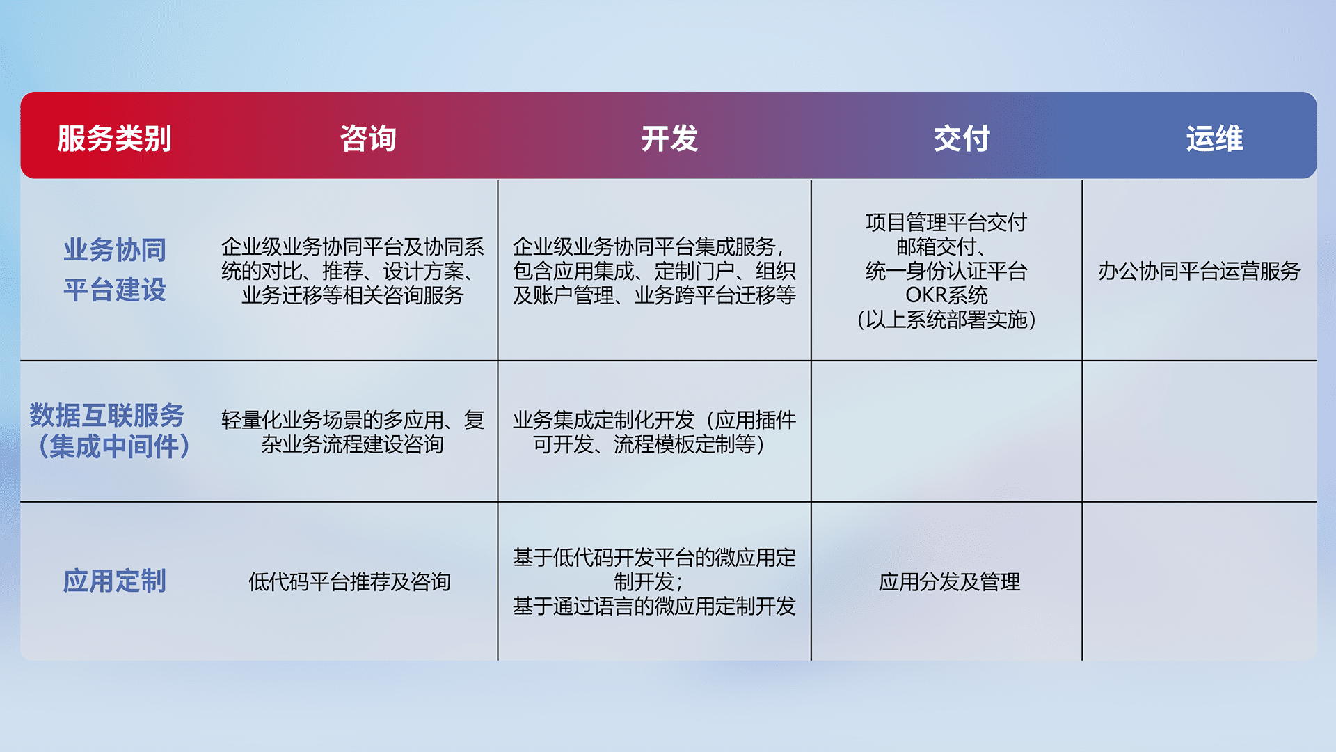 针对钉钉、、、、企微、、、、IDaas等平台级产品提供产品的规划、、、方案、、、交付、、、、定制化开发等服务,,,,实现如统一协同办公、、、、智能客户服务、、、、混合会议管理、、智能数据查询、、、等业务场景,,实现数字化转型。。。